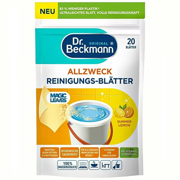 Innowacyjne uniwersalne listki do mycia wszystkich podłóg i powierzchni o zapachu cytrusów. Uniwersalne niemieckie listki czyszczące firmy Dr. Beckmann są w 100% rozpuszczalne w wodzie. Dzięki opakowaniu nadającemu się do recyklingu, arkusze zawierają o 83% mniej plastiku w porównaniu z tradycyjnymi, płynnymi, uniwersalnymi środkami czyszczącymi w plastikowych butelkach o porównywalnej ilości aplikacji na jednostkę opakowania. Do wydajnego i delikatnego czyszczenia wszystkich popularnych powierzchni.