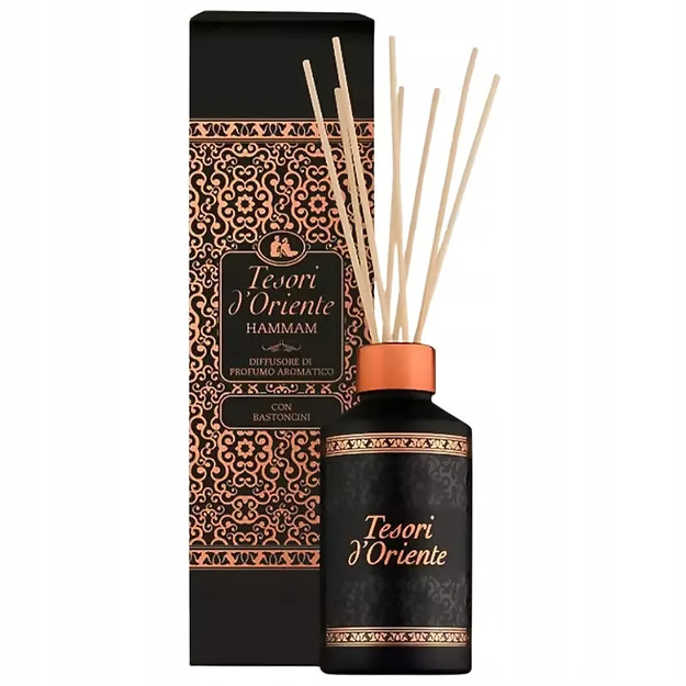 Patyczki Tesori d'Oriente Hammam to perfekcyjne rozwiązanie dla miłośników intensywnych aromatów. Ich kwiatowo-owocowa kompozycja z nutami mandarynki, migdała, pomarańczy, jaśminu i wanilii tworzy unikalny zapachowy świat. Wyjątkowa formuła zapachowa sprawia, że przyjemna woń utrzymuje się przez długi czas, wnosząc do Twojego wnętrza nuty luksusu i przyjemności. Te pięknie zaprojektowane patyczki to nie tylko źródło aromatu, lecz także ozdoba, która wzbogaci każde wnętrze.