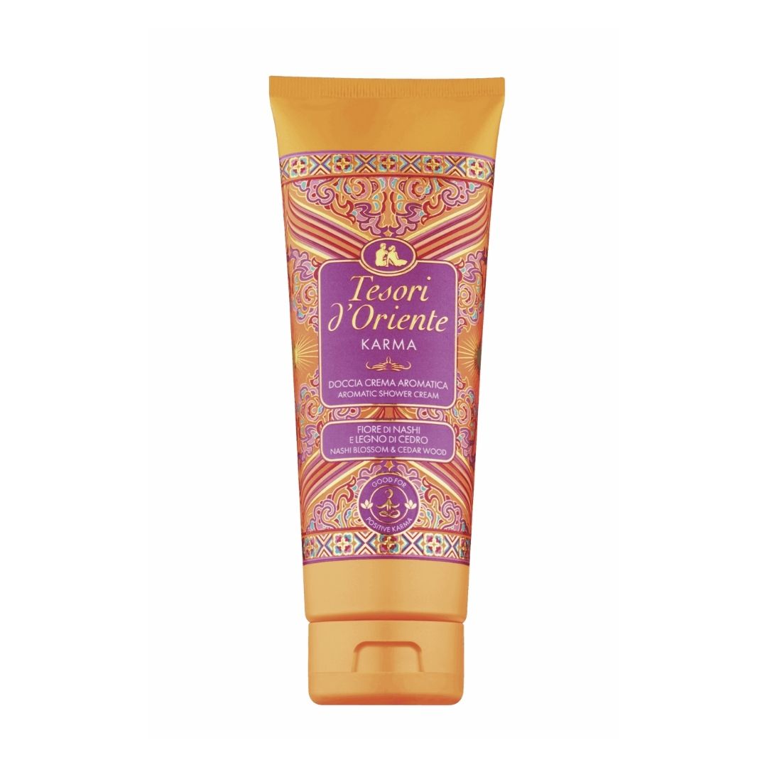 Żel pod prysznic Tesori d'Oriente Karma - dzięki wyrazistemu połączeniu cytrusowych nut cytryny i bergamotki, radosnym aromatom kwiatu Nashi oraz uspokajającym akcentom drzewa cedrowego, ten aromatyczny produkt delikatnie oczyszcza skórę i otula zmysły. Jego unikalna formuła została wzbogacona o mieszankę aromatycznych olejków, które wspierają dobre samopoczucie i pozytywny nastrój. Pozwól sobie na chwilę relaksu i zanurz się w zapachu Karma, który dodaje energii i przyjemności każdemu prysznicowi.